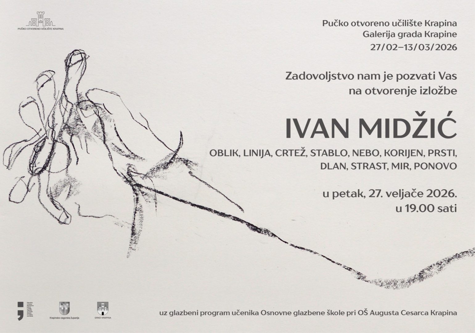 Izložba “Oblik, linija, crtež, stablo, nebo, korijen, prsti, dlan, strast, mir, ponovno” Ivana Midžića u Galeriji grada Krapine